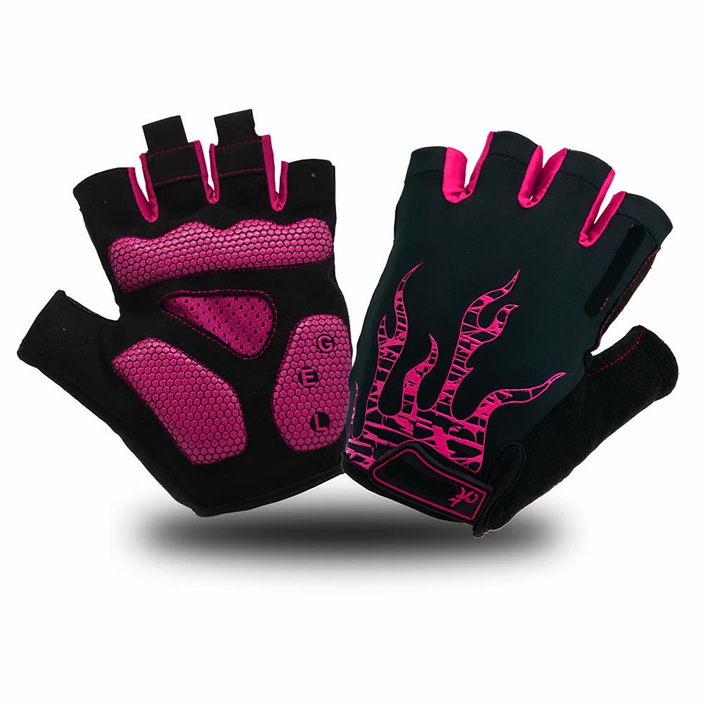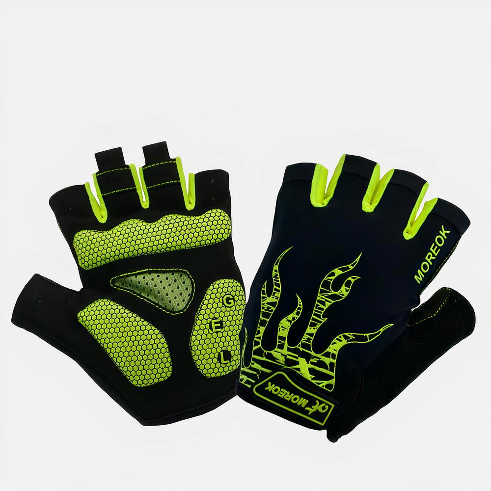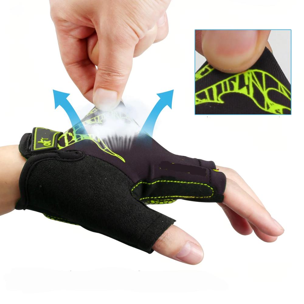 La paume de la main renferme les coussinets de gel épaissi recouverts de pastilles anti-dérapantes qui augmentent l'adhérence sur le guidon et renforcent la sécurité. Le pouce est recouvert de tissu éponge pour pouvoir éventuellement essuyer la sueur du visage rapidement, chose courante en été. Le tissu ultra respirant du dessus est conforté par les trous d'aération de la paume et les demi-doigts qui laissent naturellement circuler l'air.