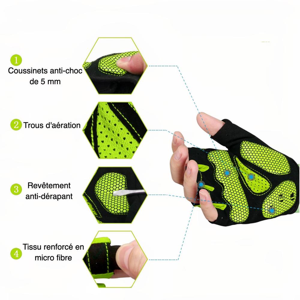 Ces gants de vélo unisexe sont fabriqués pour apporter le confort et la sécurité pendant la pratique de ce sport, que ce soit sur route ou sur piste de VTT. Conçus avec des matériaux de qualité, ils sont respirants, protègent la paume de main, et absorbent les chocs avec leurs coussinets de gel épaissi à 5 mm. Le tissu extensible du dessus est stretch et permet un ajustement parfait.